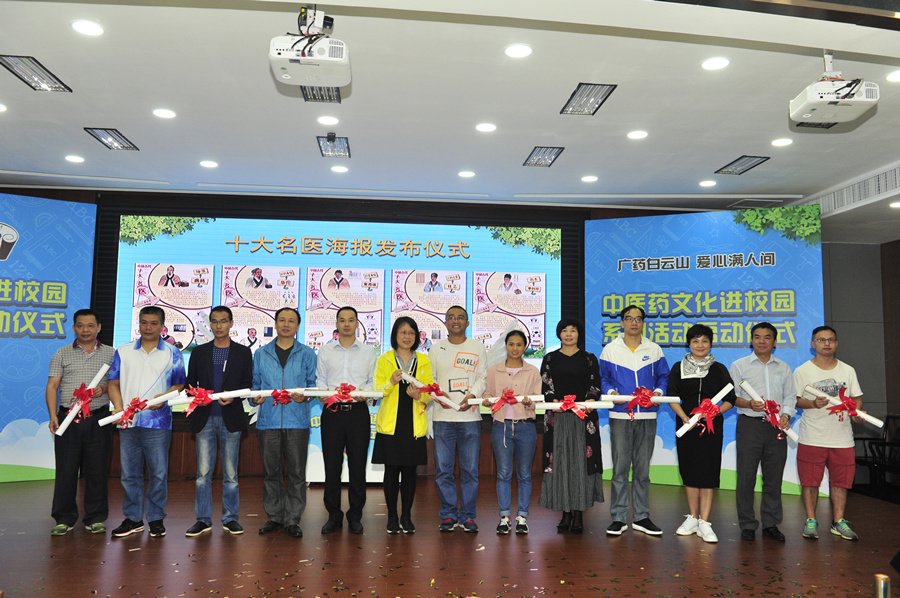 活動(dòng)現(xiàn)場(chǎng),廣雅中學(xué)師生,羊城小市長(zhǎng)代表,全市小學(xué)、中學(xué)民辦、中職等各類學(xué)校的教師、學(xué)生代表以及廣東電視臺(tái)、廣州電視臺(tái)、廣州日?qǐng)?bào)、羊城晚報(bào)等十多個(gè)主流媒體記者共聚一堂。廣州市教育副局長(zhǎng)林洽生首先“中醫(yī)藥文化進(jìn)校園志愿者”代表進(jìn)行授旗儀式。隨后,廣東省中醫(yī)藥局李梓廉副局長(zhǎng),廣州市教育局林洽生副局長(zhǎng),廣藥集團(tuán)劉菊研副總,廣東廣雅中學(xué)葉麗琳校長(zhǎng)等領(lǐng)導(dǎo)在同學(xué)們媒體記者們的見證下,共同啟動(dòng)“中醫(yī)院文化進(jìn)校園”系列活動(dòng),宣告社會(huì)各界共同努力,推動(dòng)醫(yī)藥文化扎實(shí)進(jìn)校園、進(jìn)課堂、進(jìn)教材,貫徹落實(shí)習(xí)近平總書記“中國(guó)有堅(jiān)定道路自信、理論自信、制度自信,其本質(zhì)是建立在5000多年文明傳承基礎(chǔ)上的文化自信”重要論述。活動(dòng)現(xiàn)場(chǎng)發(fā)布了“十大名醫(yī)”海報(bào),在羊城小市長(zhǎng)的帶領(lǐng)下,與全市學(xué)生代表共同宣讀《弘揚(yáng)中醫(yī)藥文化倡議書》。